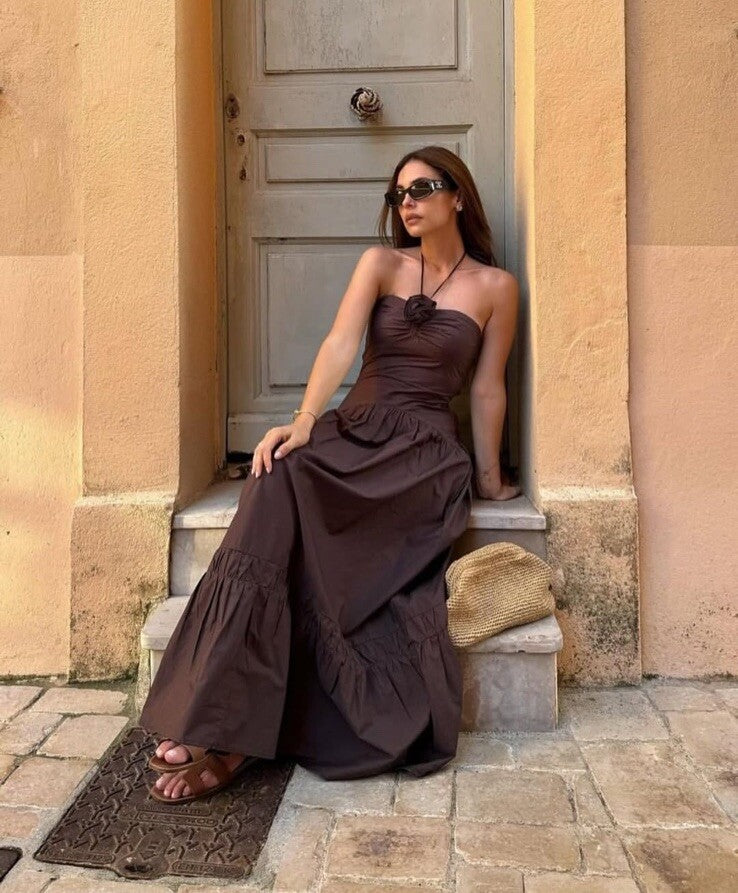 Zara Poplin Brown Dress Floor Length Brown Size medium